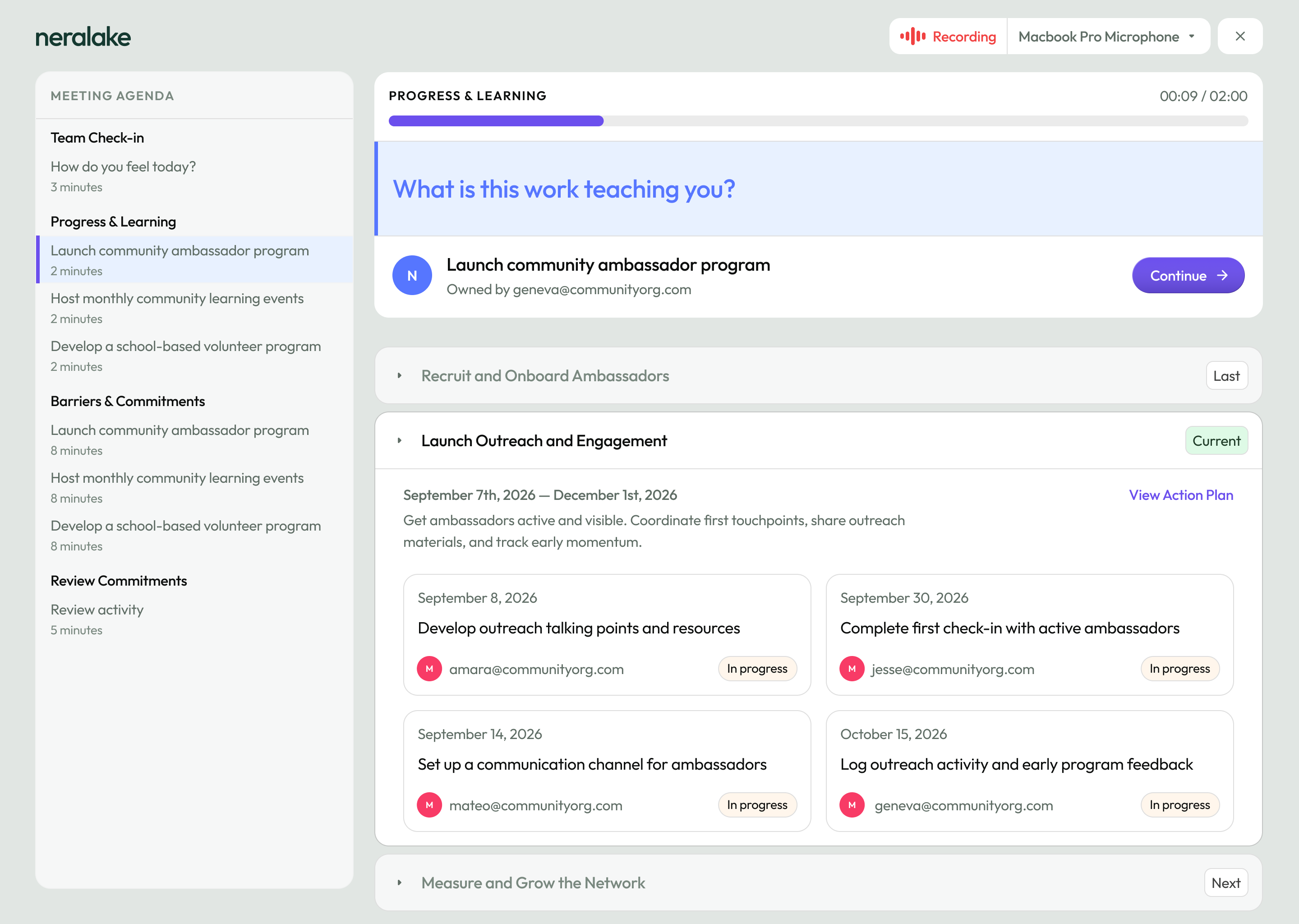 By keeping planning and follow-through connected, Neralake helps leaders focus on what matters without carrying everything alone.